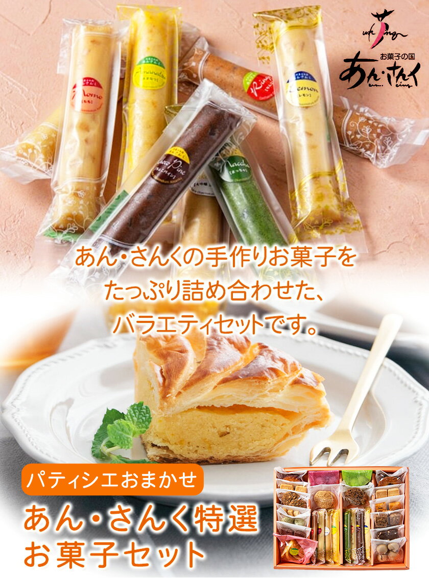 商品情報 パティシエおまかせあん・さんく特選お菓子セット 内容量 ●甘夏パイ(カット)●スティックケーキ全8種類●焼き菓子18~20個程度計27~30個程度 アレルギー 小麦、乳、卵 賞味期限 製造より1ヶ月 配送方法 常温便でお届けいたします。