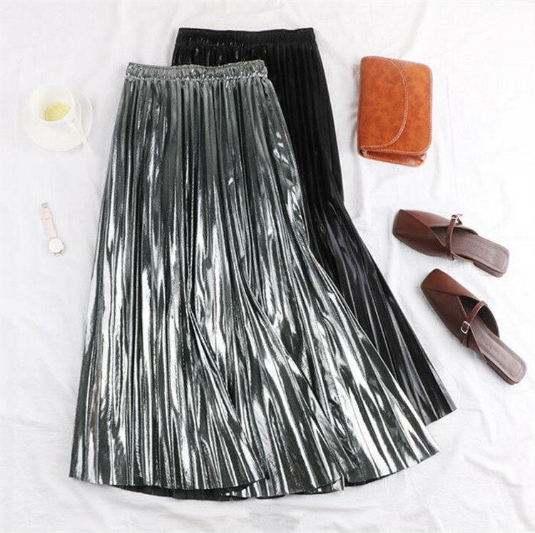 プリーツ スカート ロング ひざ丈 スイング メタリック ハイウエスト ボトムス ミモレ丈 マキシ丈 Aライン きれいめ 大人 上品 おしゃれ 可愛い 女子 無地 学生 デート OL かっこいい 春 秋 冬 シルバー ゴールド かっこいい ニュアンス ゴージャス