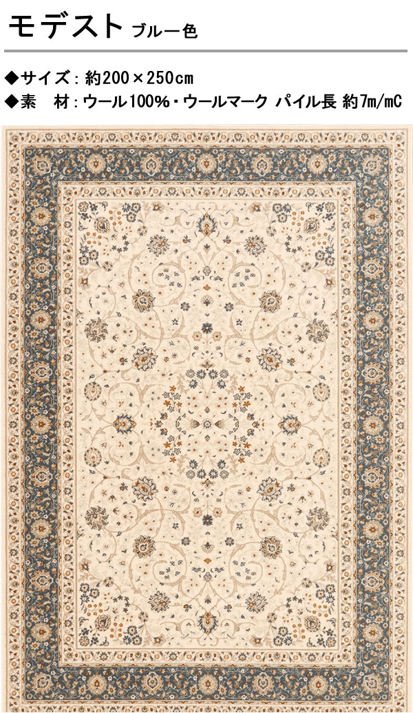 ラグ カーペット 200×250cm[モデスト]ブルー色 ウィルトン織り 長方形 毎日の暮らしを楽しくしてくれるデザインのウィルトン織りラグカーペット。