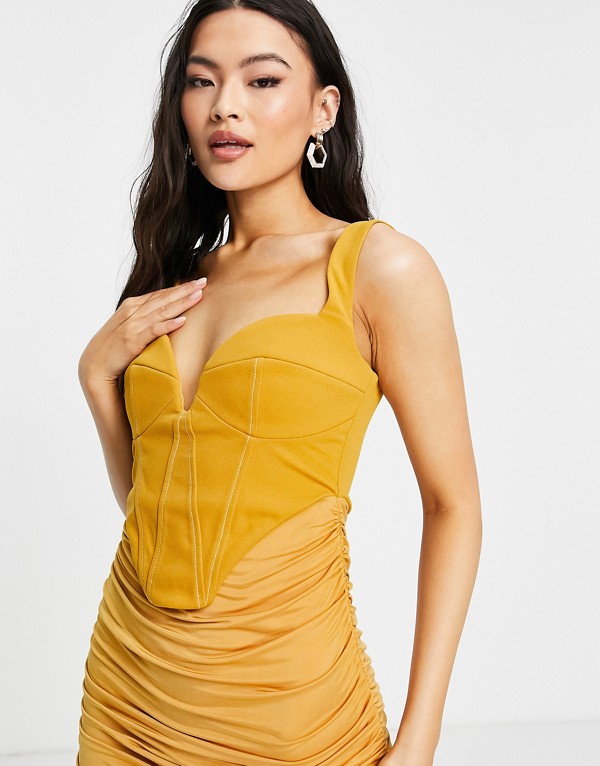 エイソス ASOS asos ASOSDESIGNコルセットビスチェとマスタードのシャーリングスリンキースカートミディドレス ワンピース レディース 女性 インポートブランド 小さいサイズから大きいサイズまで