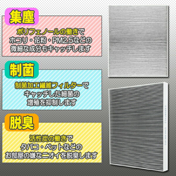 集塵ポリフェノールの働きでホコリ、花粉、PM2.5等の微細な成分もキャッチします。