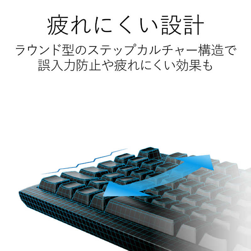●各段を階段状に配置し、各キーの上部が指の動きに合わせて湾曲した「ステップスカルプチャー構造」と、各キーの上部が窪んだ「シリンドリカル構造」により、誤入力や無駄な指の動きをなくし、快適な打鍵を実現するEXTRA TOUCHシリーズです。
