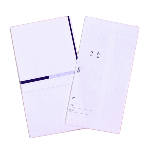 金封は版画用紙に紫と銀で水引がプリントされています。
